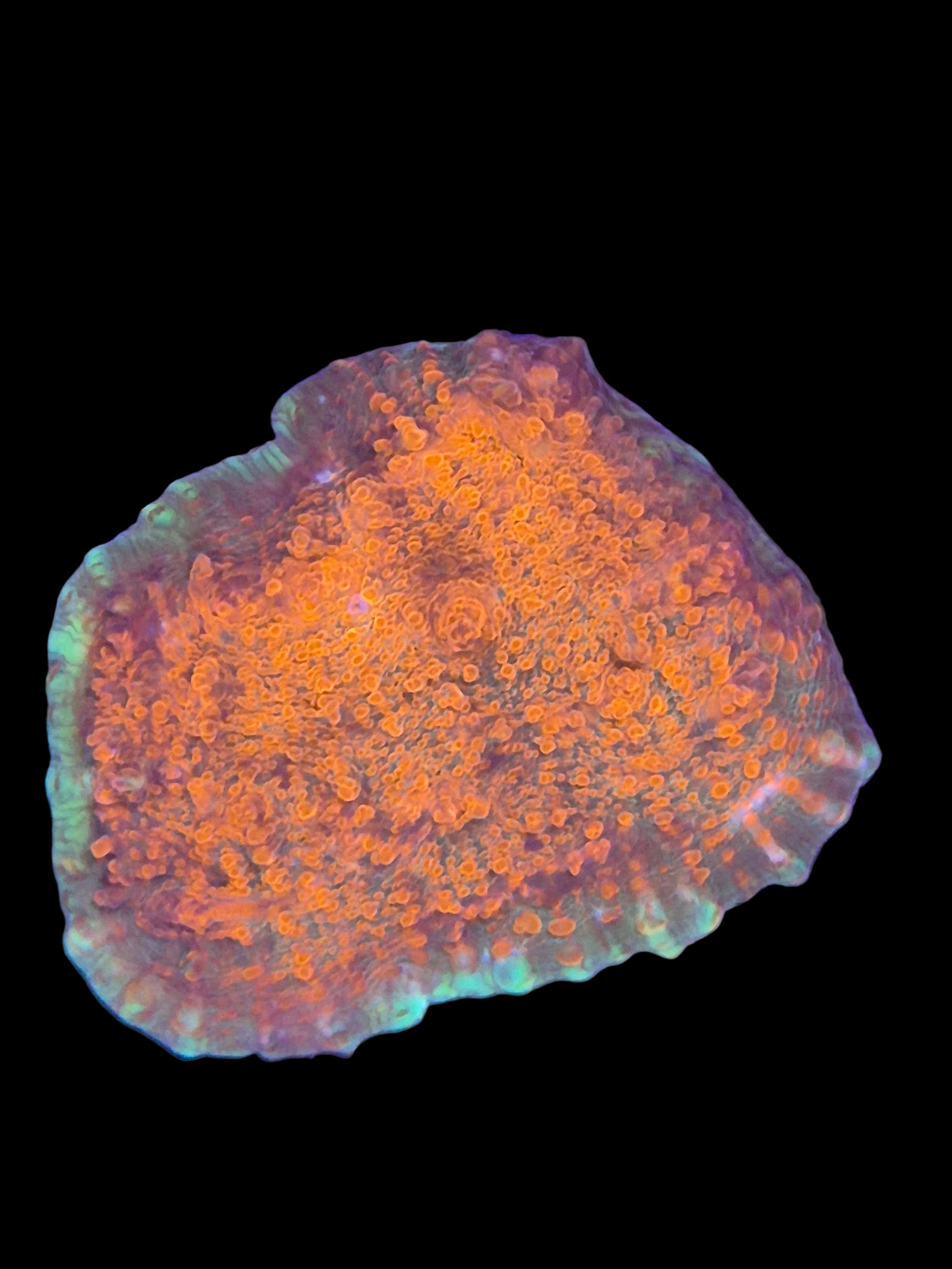 Cherry Garcia Chalice (Echinophyllia sp.) Is a large polyp stony (LPS) coral which encrusts at first, then grows outwards into a wide, flat plate. It is a deep red with lighter highlights and light green/cream coloured edges. As with other chalice coral it requires low to moderate light and moderate, indirect flow with stable water parameters in the recommended ranges.