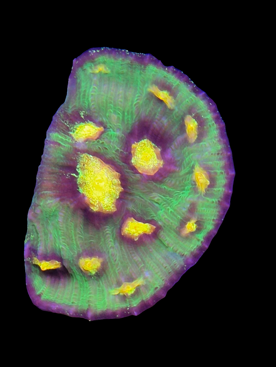 Raja Rampage Chalice (Mycedium sp.) Is a large polyp stony (LPS) coral which encrusts at first, then grows outwards into a wide, flat plate. It is a vibrant green colour with yellow mouths with black outlines. As with other chalice coral it requires low to moderate light and moderate, indirect flow with stable water parameters in the recommended ranges.